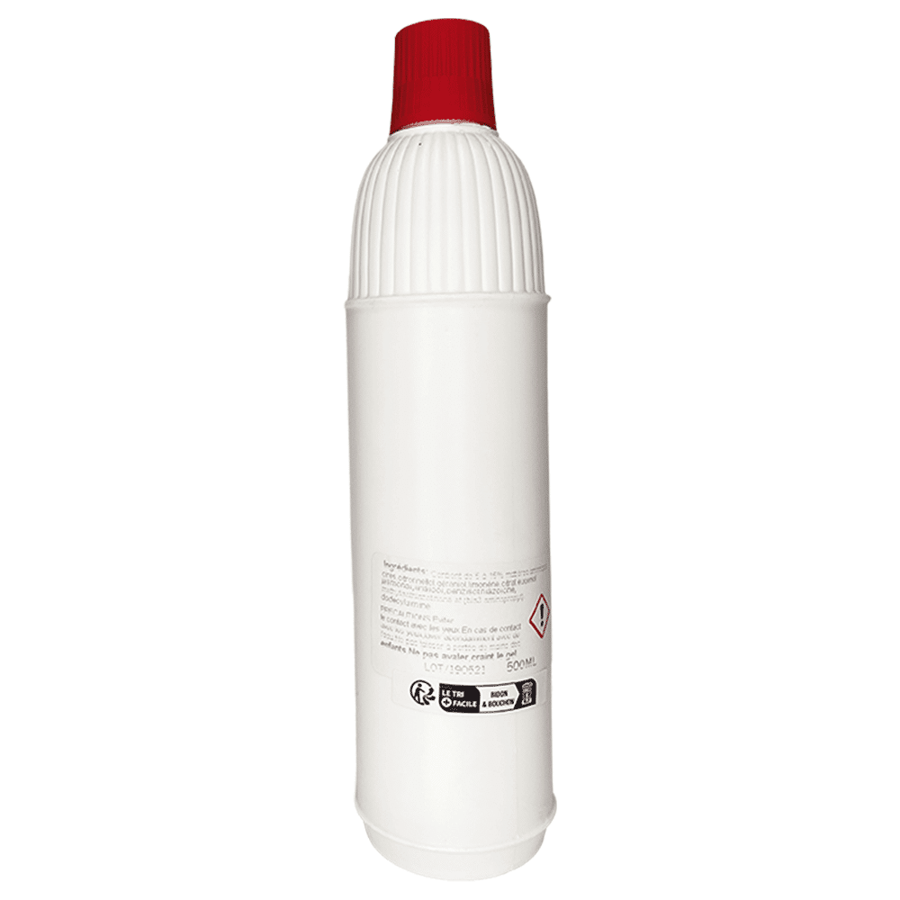Tensioactifs anioniques 5 à 15%, cires, citronellol, géraniol, limonène, citral, eugénol, conservateur autorisé.